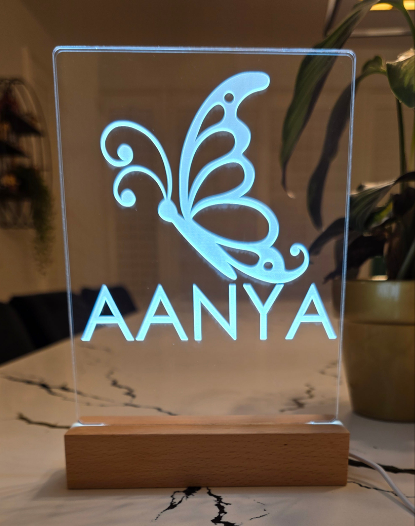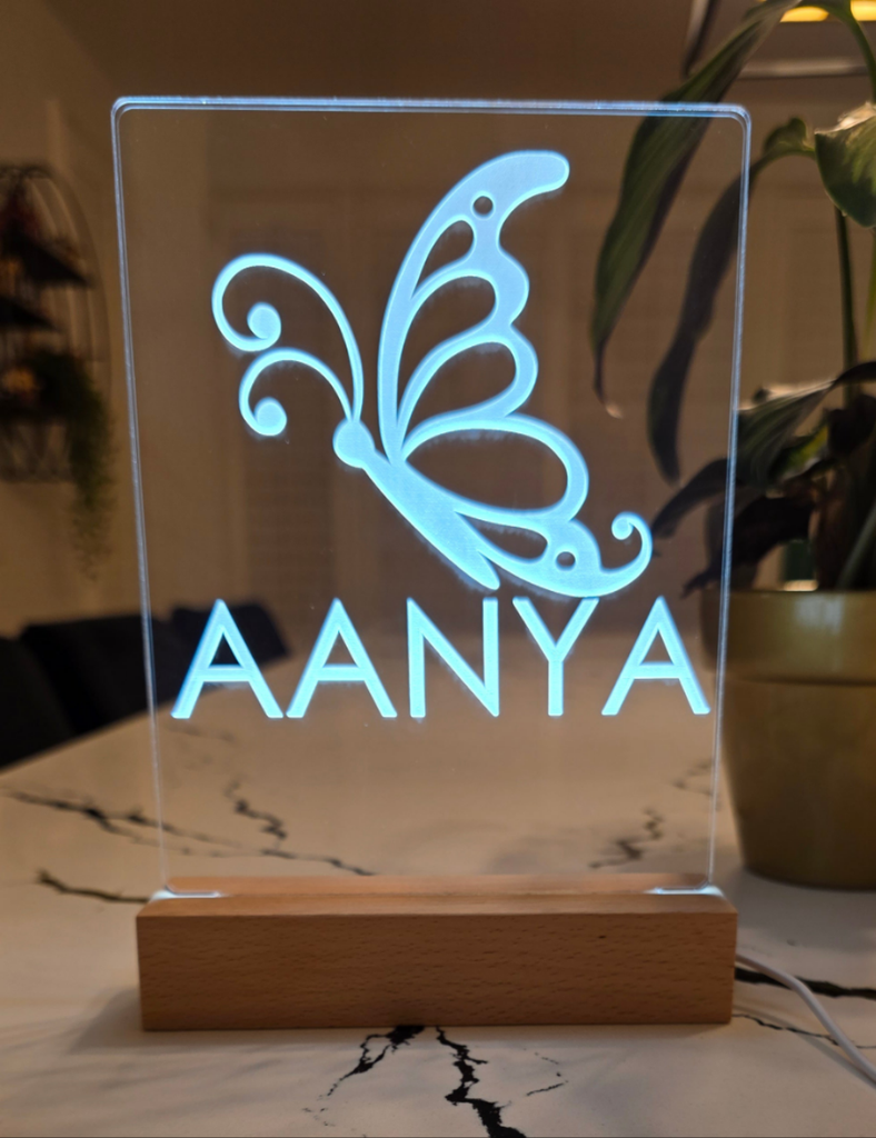 Our custom LED night light is beautifully designed with your chosen name and a delicate engraved design that glows when lit. Perfect for kids’ rooms, nurseries, or as a thoughtful gift, this night light adds both comfort and charm.